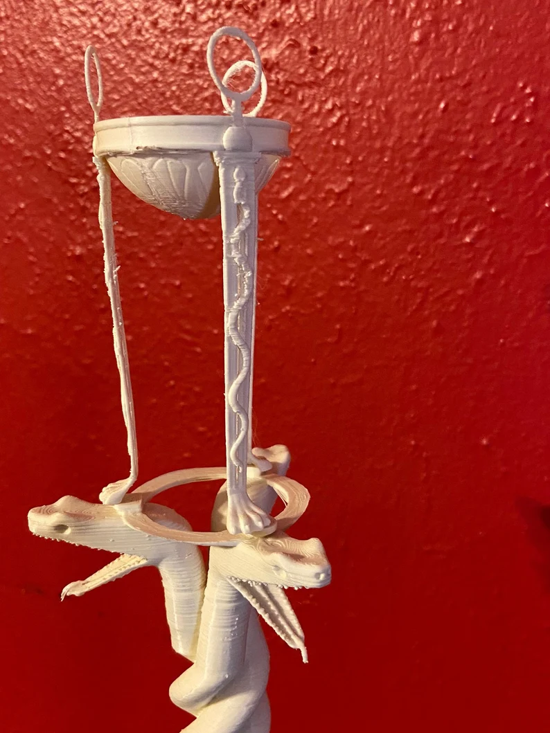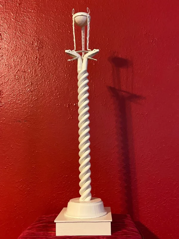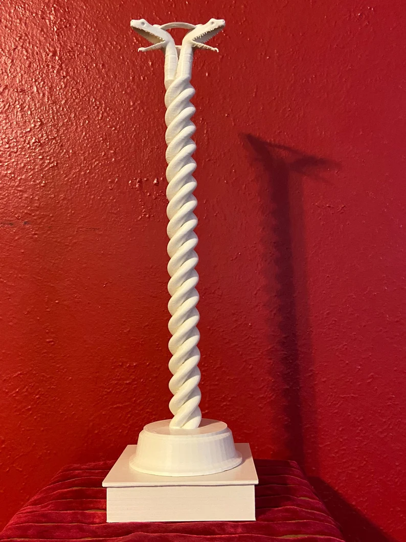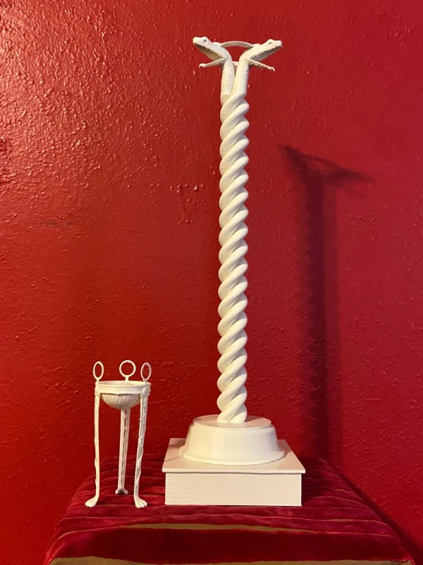 This is a partial replica of the serpent column and tripod at the Sanctuary of Apollo in Delphi. It was dedicated to Apollo to commemorate the Greeks who fought and won the battle of Plataea against the Persians. The 3 snakes represent the PanHellenic unity of the Greek people against the Persians and adversity, with the 31 coils representing the 31 united Greek cities. If the Greeks had not won, Rome would not have been the superpower that we know today. This is a partial replica because only 18 coils are on this piece, due to our trying to make it more scaled to be used at the altar, Lararium, or sacred space, as well as bookshelf or display. We ship it in 3 pieces (column, square base, and tripod), and the tripod sits on the top of the snakes. The tripod is for decoration only, and cannot be used as an actual burner. However, tiny tripod burners made for incense can be used, as well as glass tealight candle holders and placed on top of the snakes. As always, please monitor any candle burning or incense use according to safety guidelines. The entire piece stands 55.5 centimeters tall, 43.5 centimeters when standing on the square base without the tripod , and 40 centimeters without the square base and tripod. A beautiful piece for any altar, bookshelf or sacred space.