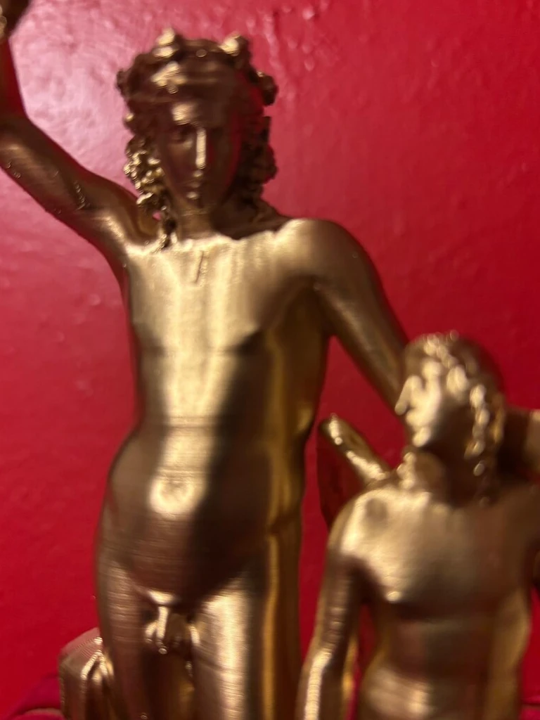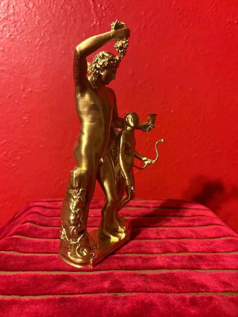 This 3D printed reproduction is a copy of the famous statue of Dionysus and Eros, housed in the National Archaeological Museum of Naples. The sculpture depicts Dionysus, the Greek god of wine, fertility, and theater, accompanied by Eros, the god of love and desire. Dating back to the 2nd century BCE, this piece is a remarkable example of Hellenistic art, celebrated for its expressiveness and intricate details.