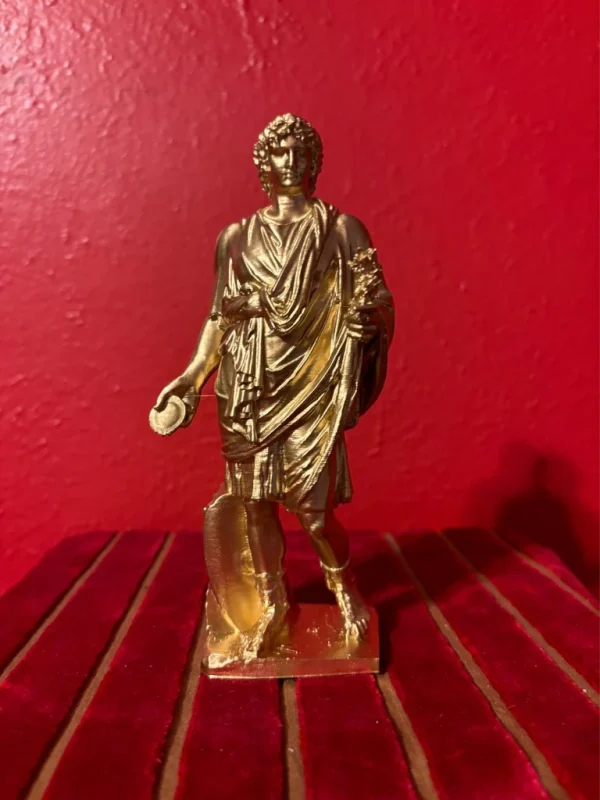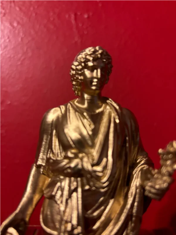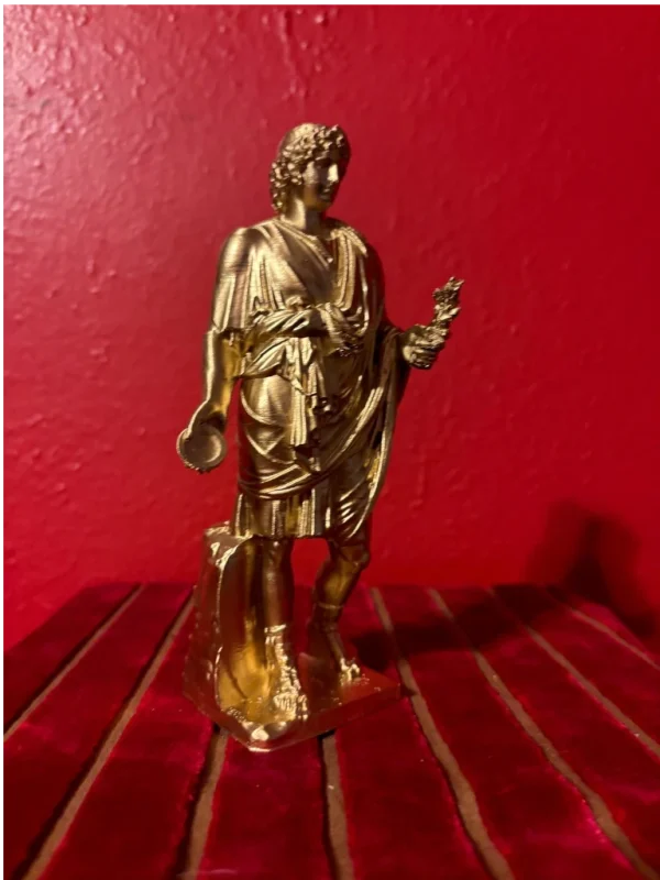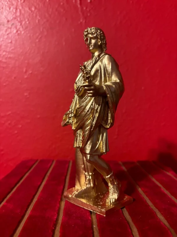 This small gold-painted statue is the perfect size for your Lararium, shrine, altar, or sacred space! (The statue in the photos shows our first printing prototype and yours will be even better so no worries about lines or imperfections as we have perfected the print). The Lares, minor deity guardians specific to a family, locale, community, or institution, originate from the Etruscan word Lar, meaning “lord.” Originally gods of cultivated fields, each household worshipped them at crossroads where their allotments met others. Later, they were revered in homes alongside the Penates, gods of family prosperity and the storeroom, with the household Lar Familiaris at the cult’s center. Divided into two categories: Lares domestici, protecting the home, and Lares publici, safeguarding public institutions like cities, they were believed to influence events within their sphere. Traditional Roman households celebrated them annually, offering daily food and cult rituals, and associating them with the home. Represented by metal or wax statuettes, typically kept together in a wall recess or small family shrine called a Lararium.