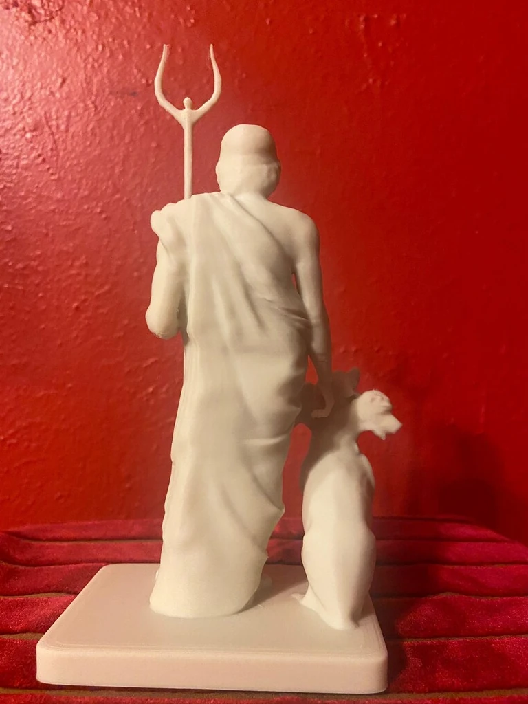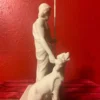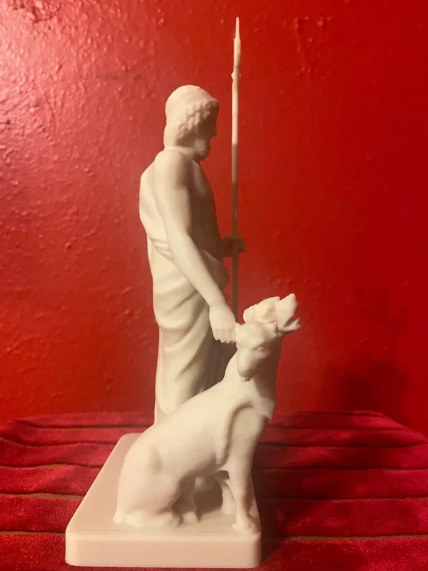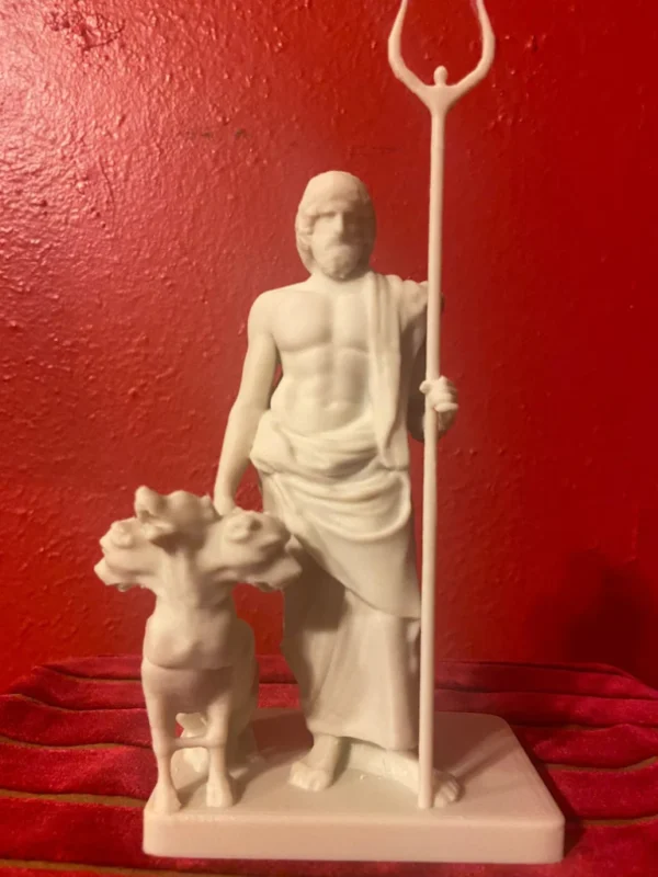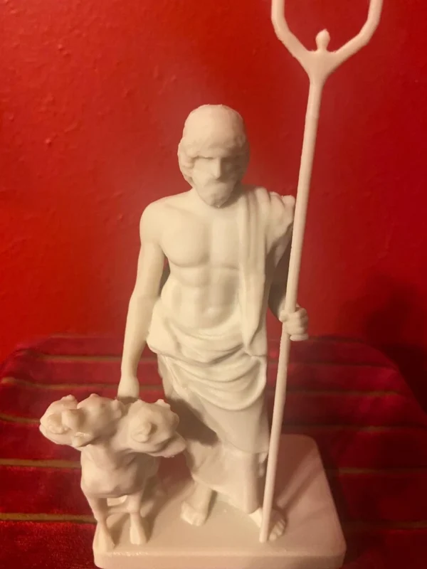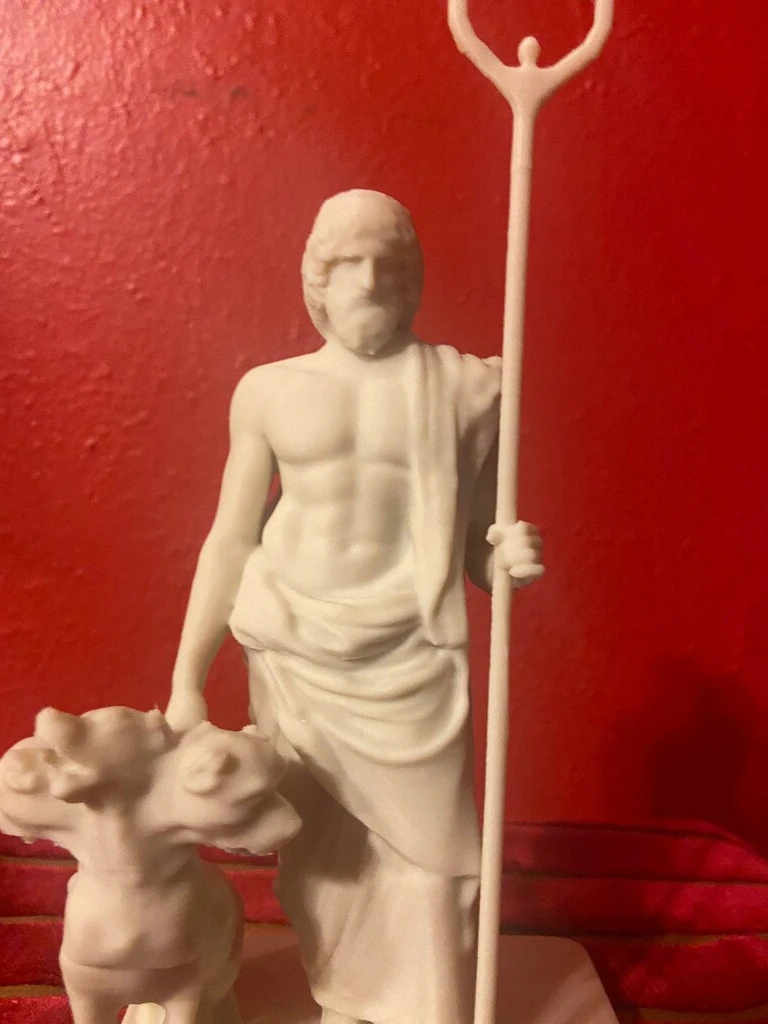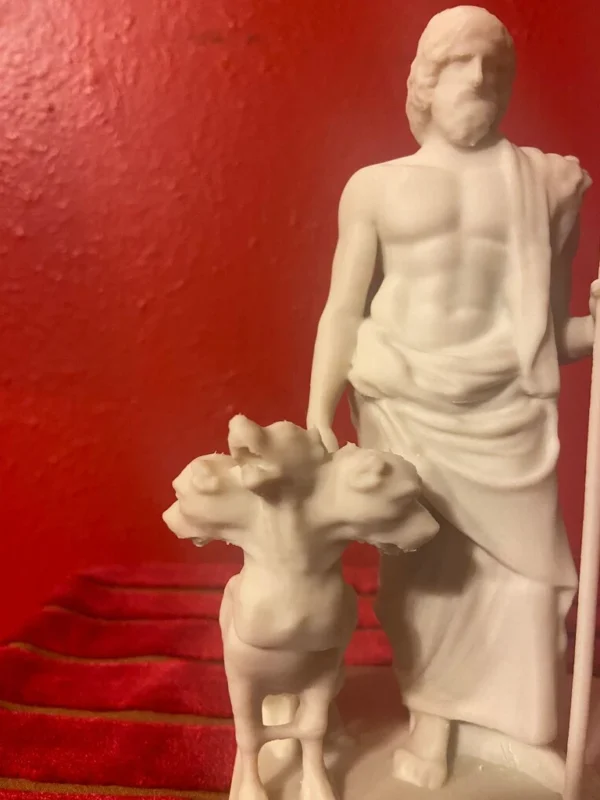The reconstructed statue combines the Ludovisi Pluto bust with a previously incomplete body, portraying Pluto in a majestic and authoritative stance. In his left hand, the sculptor has restored Pluto’s bident, symbolizing his absolute power over the underworld. Resting alertly at his lower right side is Cerberus, the three-headed dog guarding the gates of the realm of the dead. Cerberus is meticulously sculpted, with each head displaying a fierce expression, vigilantly protecting the entrance to the underworld.