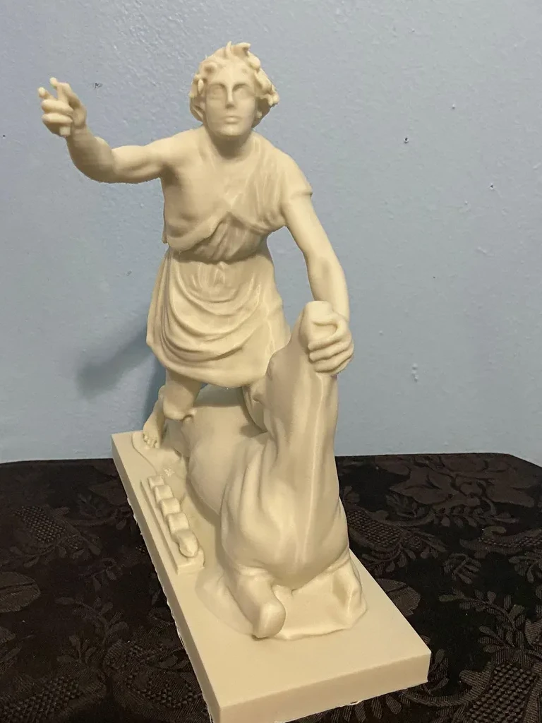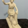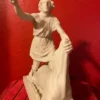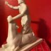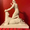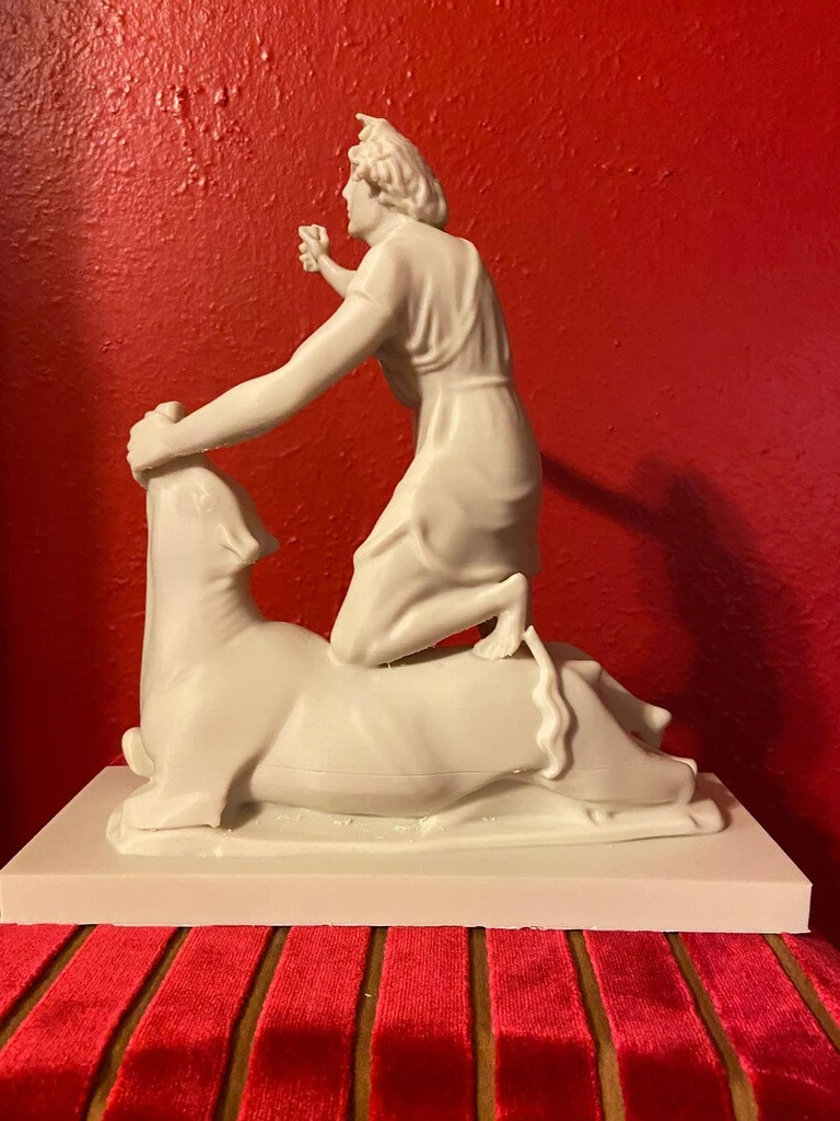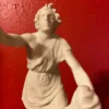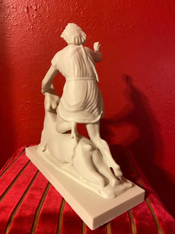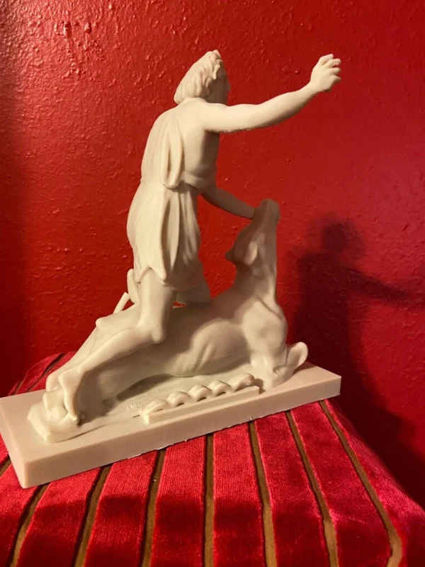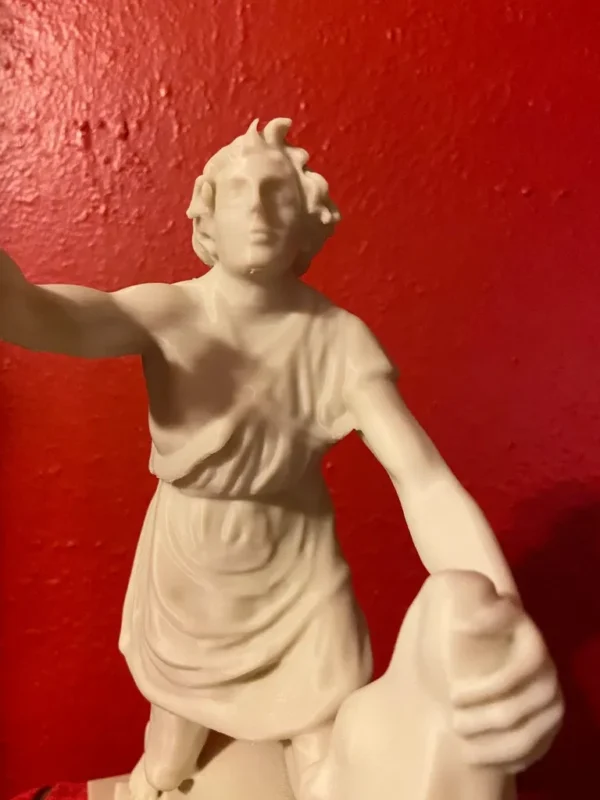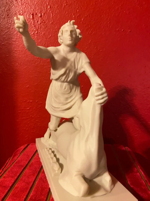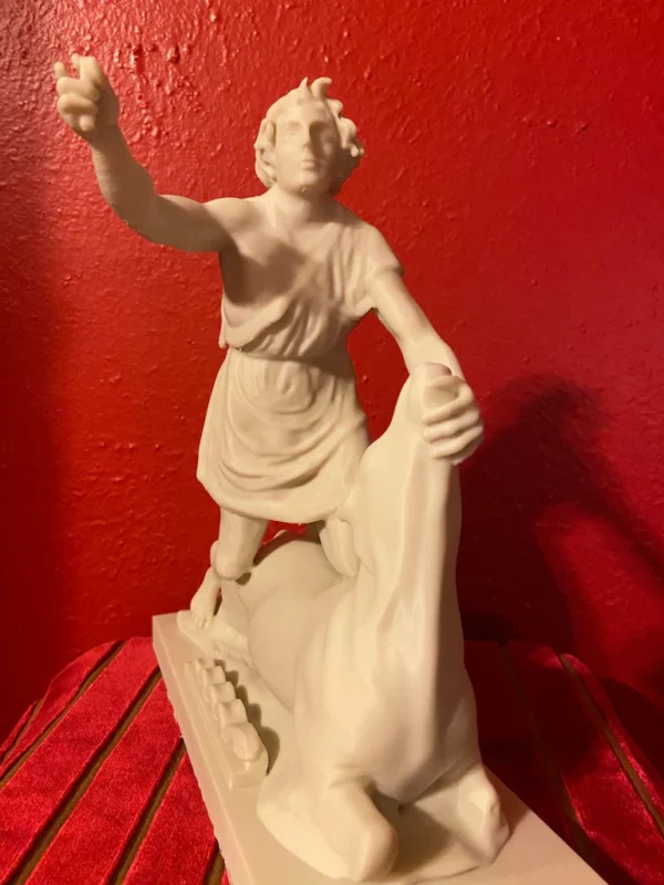 This replica is modeled after the impressive original Greek marble sculpture discovered in situ at the Mithraeum of Ostia Antica. Standing 5 feet 7 inches (1.70 m) tall, the statue depicts Mithras in a striking and unusual heroic pose. Unlike typical representations, he does not wear the classic Eastern attributes; instead, the young god is dressed in a short Greco-Roman tunic that leaves half of his torso exposed and is barefoot. Mithras grips the bull beneath its muzzle with his left hand while raising his right hand, holding a dagger poised to strike. He presses the animal down with his knees, and a snake coils at the base. Notably absent are the scorpion and dog, which commonly appear in other depictions. On the bull’s chest is a Greek inscription naming the sculptor: Kriton the Athenian made this work. This likely refers to Marcus Umbilius Kriton, an artist active during the first half of the second century CE. His signature is also associated with another Roman Mithraeum finds, such as the Mitreo della Planta Pedis. The original statue shows signs of ancient damage and was restored with gray marble. Missing are parts of the dagger and the bull’s limbs, while the head and arms were repaired during Roman times. The sculpture rested on a diagonal masonry base (about 0.30 meters high) beneath one of the vaulted skylights designed to dramatically illuminate the god’s head during ceremonies. The Mithraeum itself was likely constructed in the first half of the third century CE. For centuries, fragments of the statue, including the bull’s head and parts of Mithras, were found in a drainage channel inside the Mithraeum. These were discarded by Christians who later built a structure over the sanctuary. The torso was part of the Giustiniani collection and was returned to Italy in 1999 after investigations revealed its illicit origins. This replica of the statue is remarkable and unique because Mithras is portrayed more like a Greco-Roman hero than in the traditional Eastern garb. He wears no Phrygian cap and is not accompanied by the typical animals or figures commonly seen in Mithraic groups. His ecstatic expression and raised arm reveal a distinctive, personal interpretation of the bull-slaying legend that sets this work apart from other known representations. This replica aims to faithfully capture both the original composition and the sanctuary’s unique atmosphere, emphasizing the central figure of Mithras and his symbolic battle against darkness.