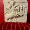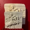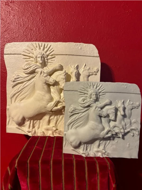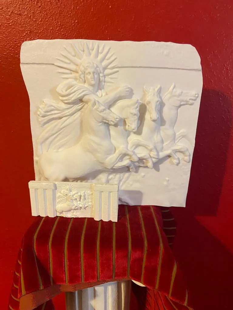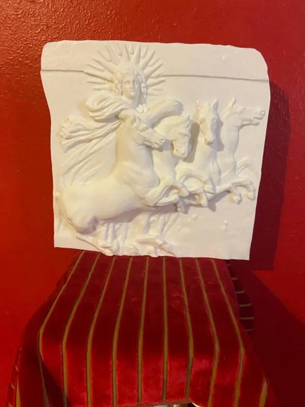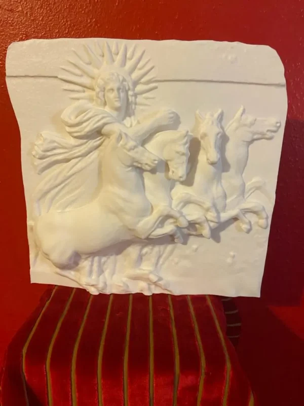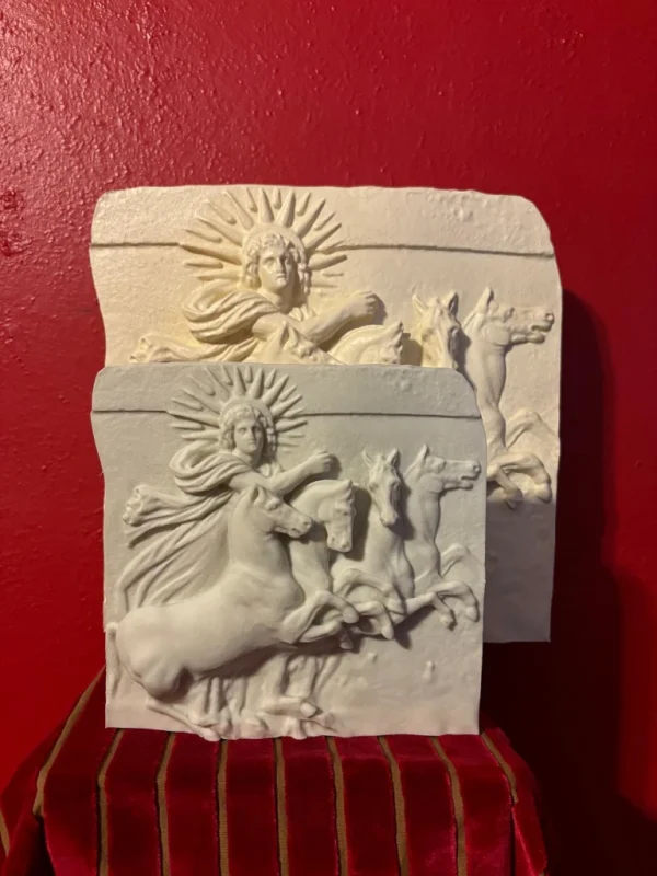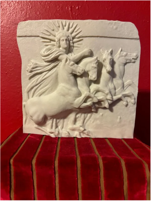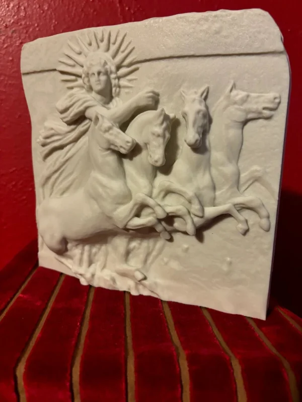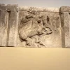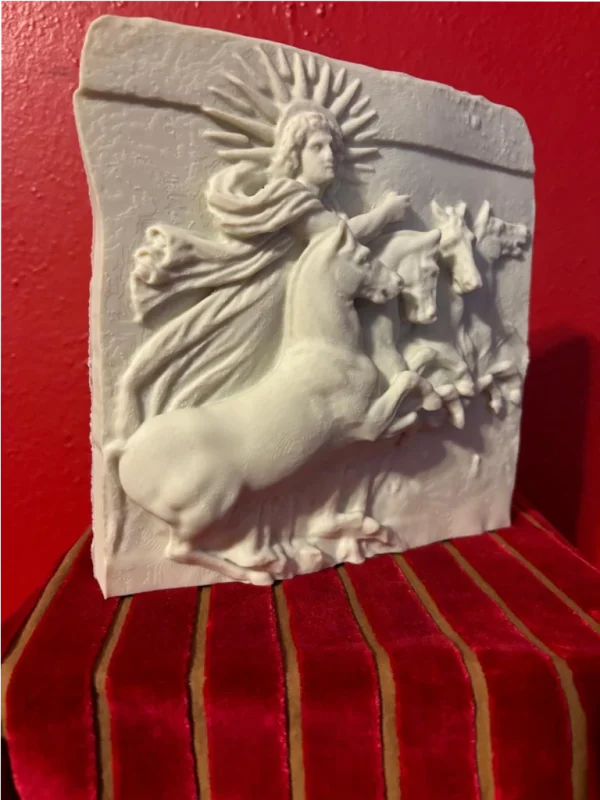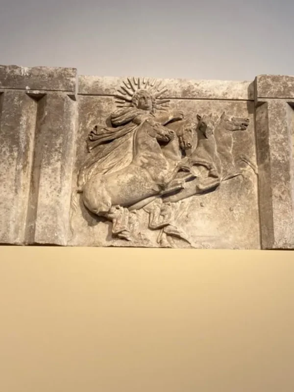 This is a restored metope of Helios in a quadriga that was originally located in the Temple of Athena in Ilion, Troy, dating back to 300-280 BC. The row of sculpted metopes on the north side of the temple dedicated to the city’s goddess, Athena, began with an image of the sun god’s quadriga rising out of the sea. Like the Parthenon in Athens, the row likely continued with depictions of battles for Troy and concluded with the moon goddess, Selene.