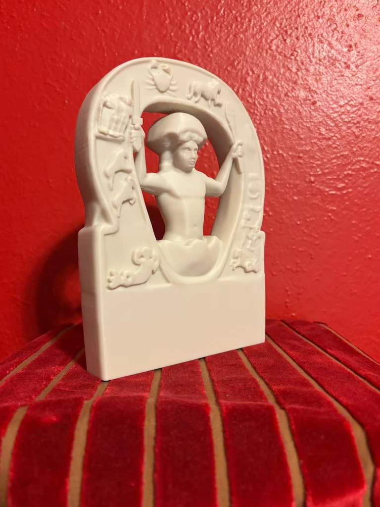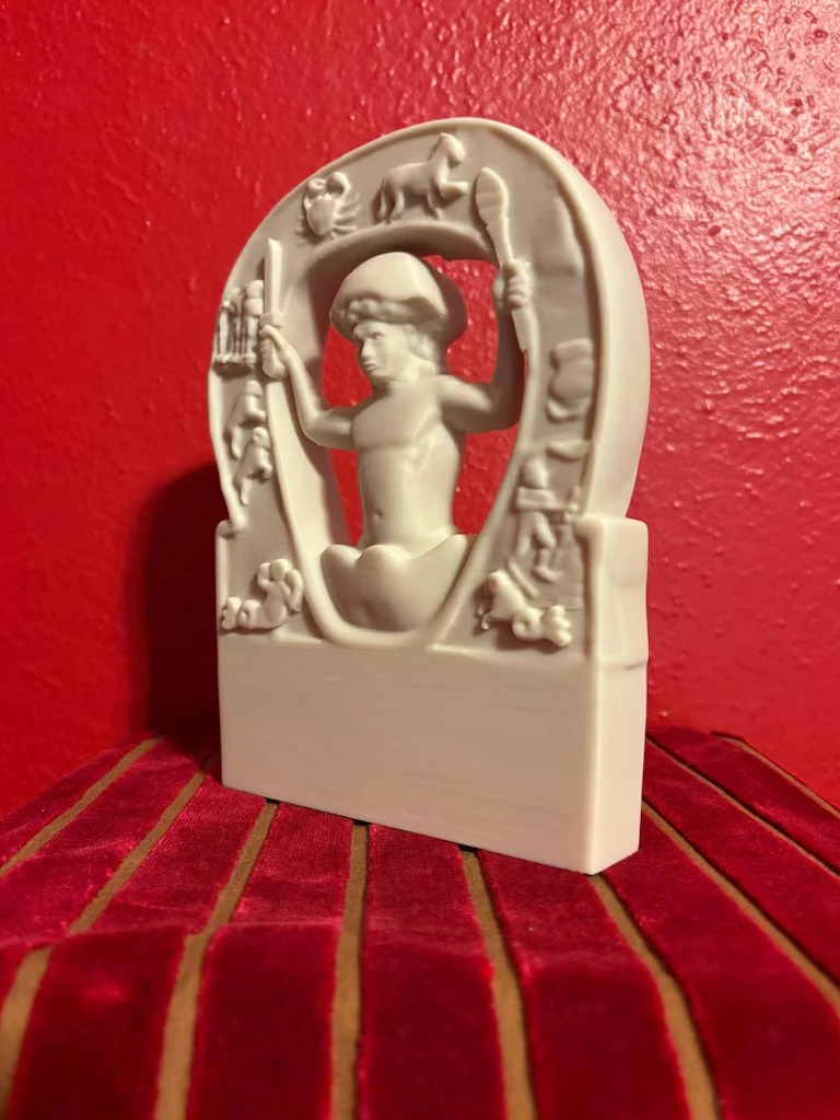 This extraordinary reproduction in PLA of the stone relief sculpture, dated to approximately 200-300 CE, depicts Mithras emerging naked from a cosmic egg, surrounded by an egg-shaped zodiacal design that symbolizes the universe. It was discovered in the Mithraeum of Vercovicium (now known as Housesteads Roman Fort), near Hexham in Northumberland, and is currently preserved at the Great North Museum in Newcastle upon Tyne. This is the only known depiction in Britain of the birth of Mithras from the cosmic egg. The symbolic power of the sculpture remains evident: the scene fuses the figures of the Orphic creator God Phanes and the God Aion with Mithras, offering a unique syncretic interpretation. This exceptional piece also represents the earliest known depiction of the zodiac in Britain and remains one of the most significant Mithraic works recovered from the area surrounding Hadrian’s Wall, on the northern frontier of the Roman Empire. This piece is truly essential for any Roman altar or Lararium, and especially fitting for commemorating the birth of Mithras, “the true God born on December 25,” not the Galilean.